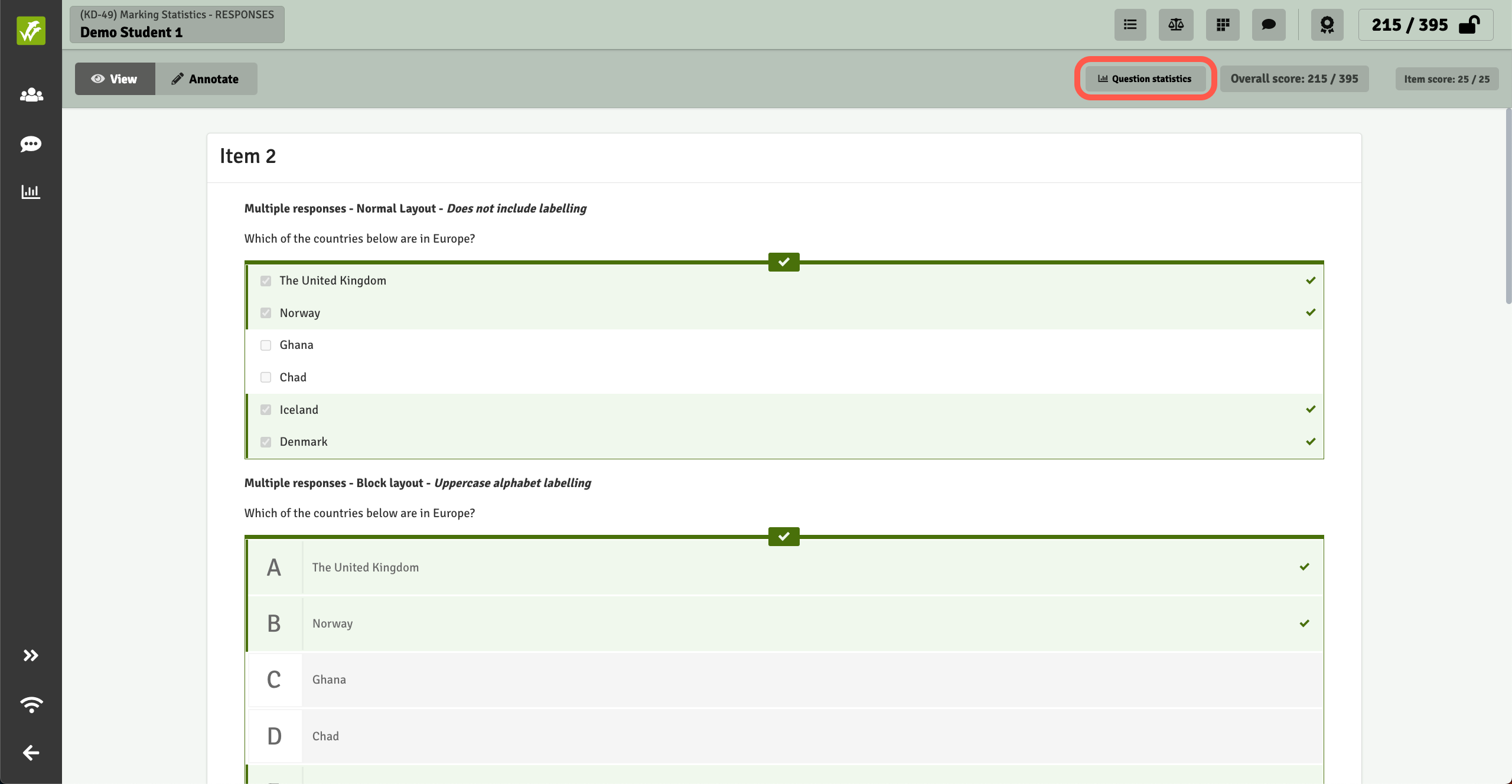 The Question statistics window will display question responses and scoring statistics for the item currently being viewed within the marking tool.