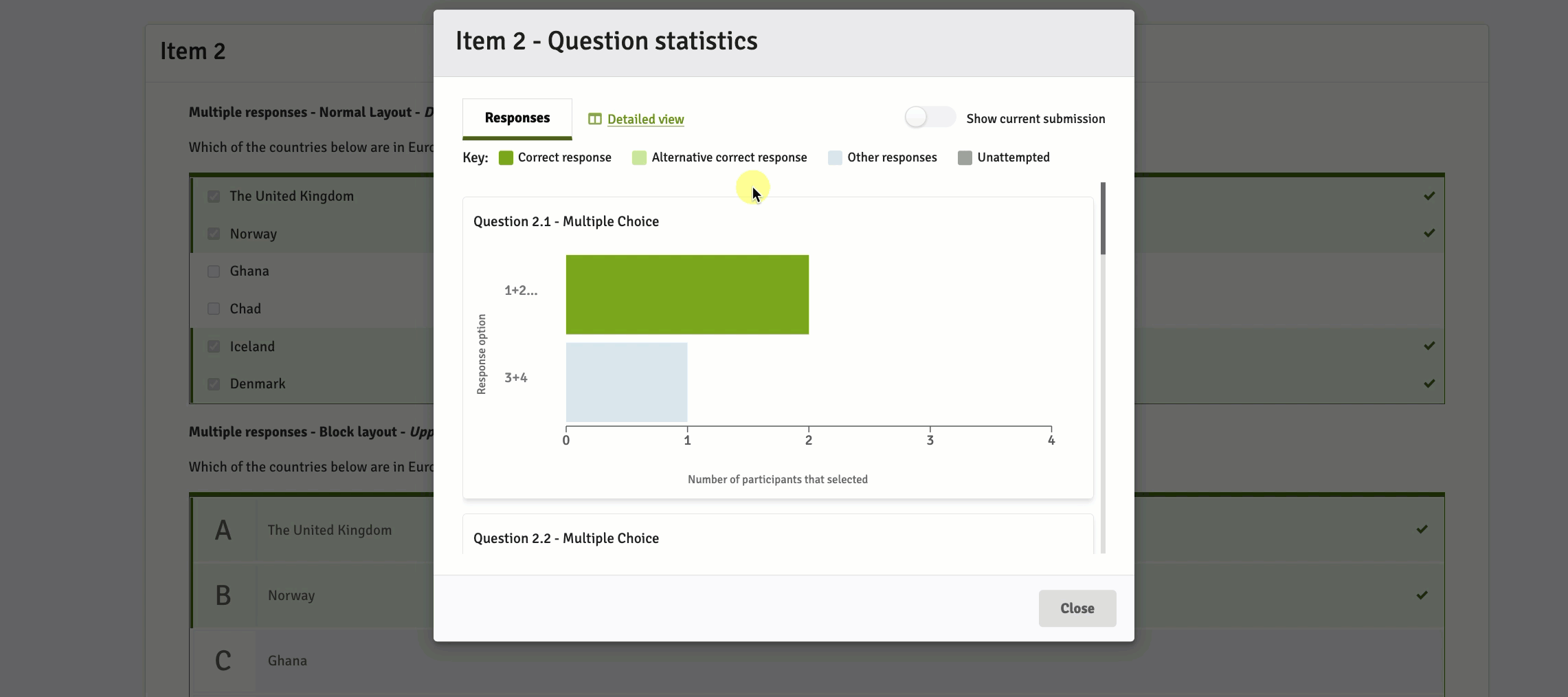- Item (detailed view): Displays the detailed view including the full question and the response validation of the correct answer(s), (if auto-scored).
